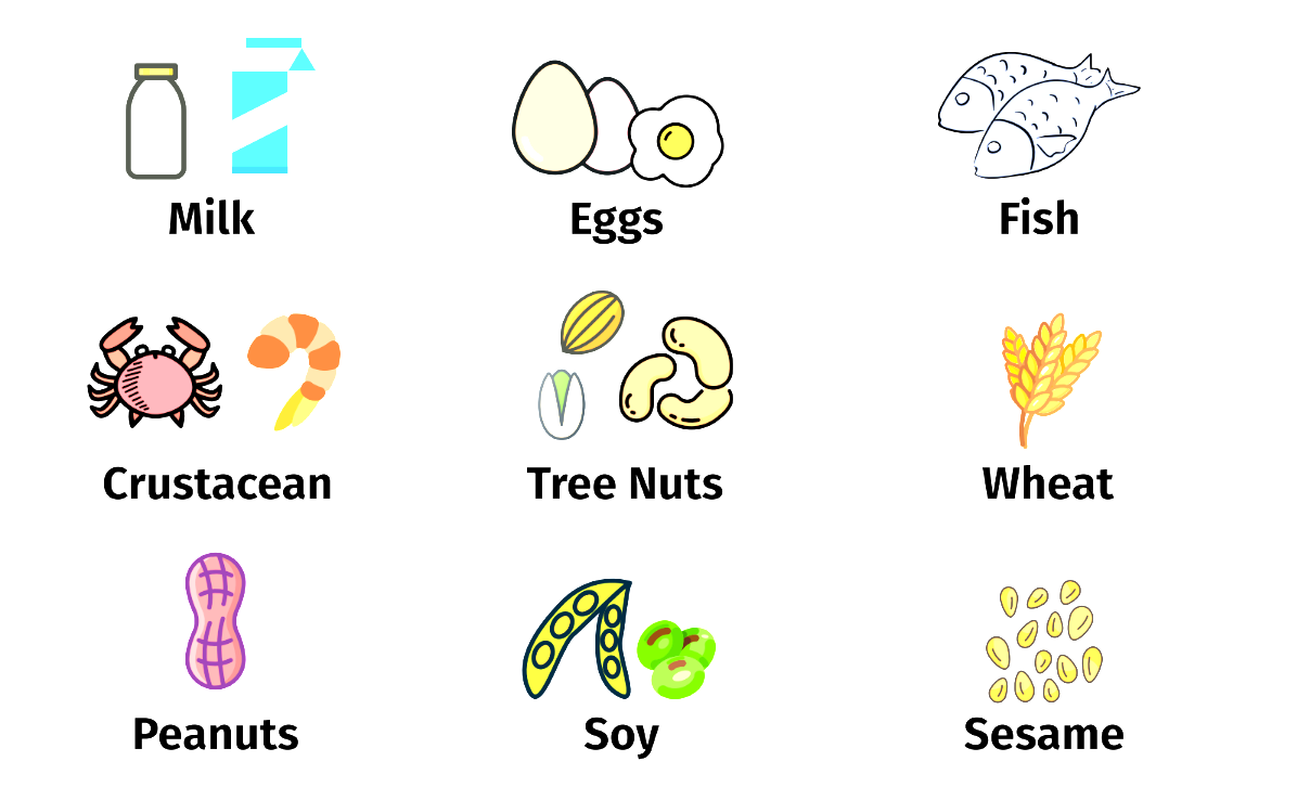 Milk, Egg, Fish, Crustacean Shellfish, Tree Nuts, Peanuts, Wheat, Soy, and Sesame.